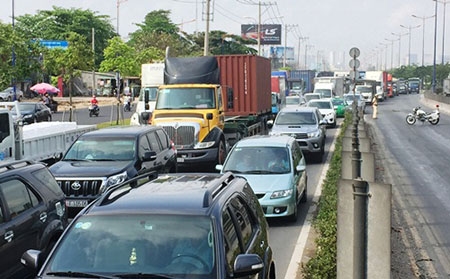 Một hướng của cầu vượt Thủ Đức bị phong tỏa khiến dòng xe kẹt cứng. Ảnh: Hải Hiếu |