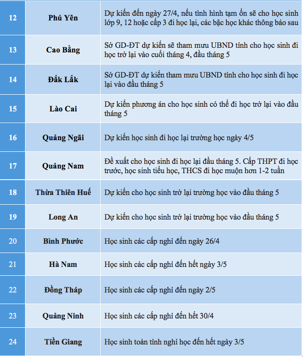 Ngày 21/4, lại có thêm 4 tỉnh thành gửi công văn thông báo của UBND tỉnh cho học sinh đi học lại từ ngày 23/4 là: Gia Lai, Yên Bái, Hải Dương, Hải Phòng. Tính đến thời điểm hiện tại, một số địa phương cũng đã lên kế hoạch dự kiến, đề xuất về thời gian đi học trở lại của học sinh các cấp trên địa bàn, danh sách cập nhật tới ngày 22/4 như sau: