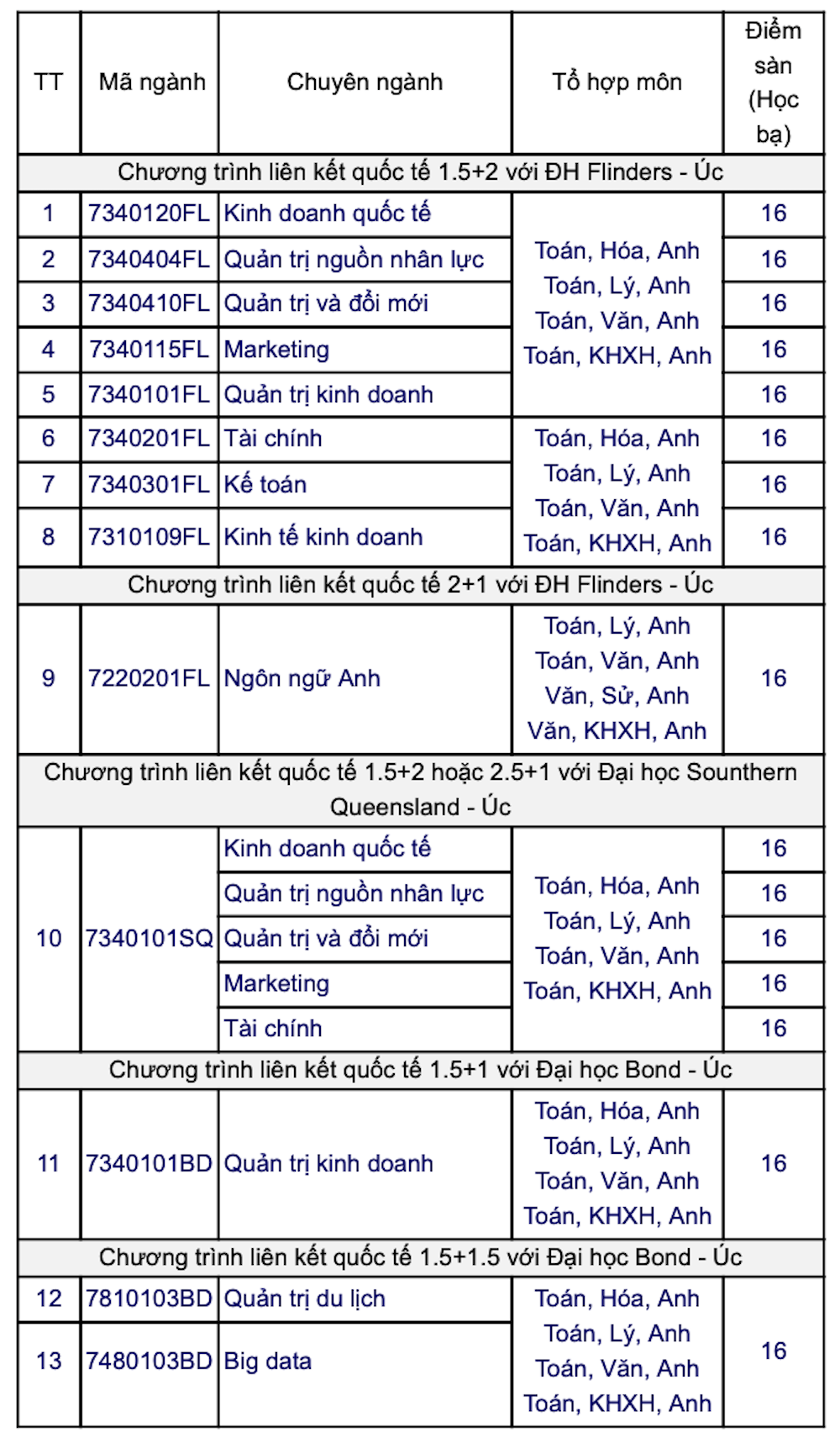 Phương thức xét tuyển dựa trên chứng chỉ/bằng tốt nghiệp THPT quốc tế, thời gian nhận hồ sơ đến ngày 15/9. Cụ thể, thí sinh có bằng tốt nghiệp THPT quốc tế (IBD, A-Level kết hợp với AS-Level hoặc IGCSE, WACE, SACE…); hoặc chứng chỉ bài thi đánh giá khả năng học thuật quốc tế (TestAS, SAT, ACT), bằng tốt nghiệp THPT quốc tế được công nhận theo quy chế tuyển sinh của trường.