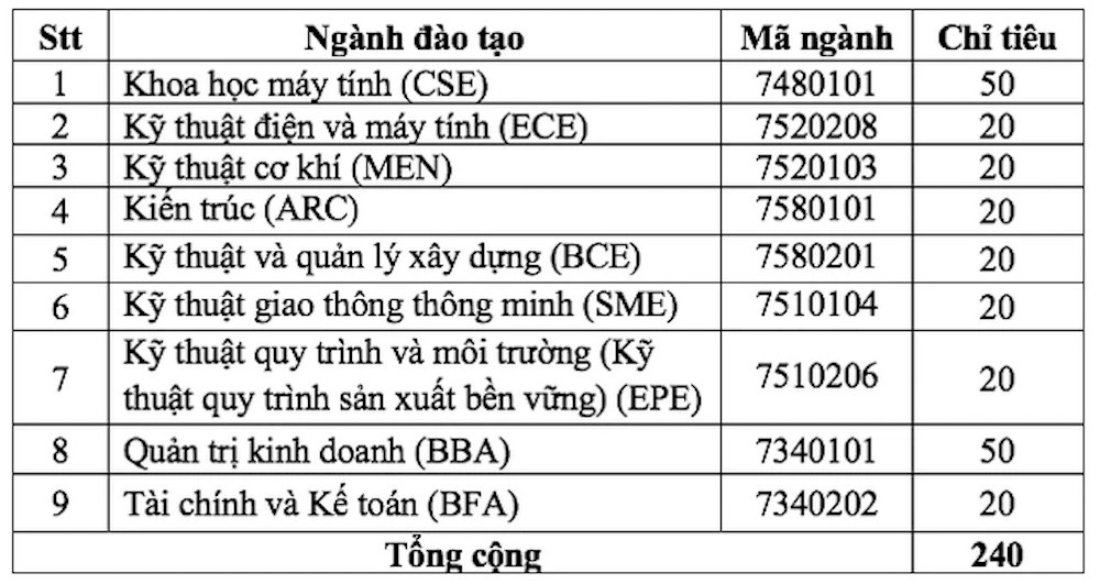 Phương thức xét tuyển thẳng, thời gian nhận hồ sơ đến 15/9. Trường tuyển thẳng thí sinh có thành tích học tập xuất sắc gồm: Thành viên đội tuyển quốc gia tham dự kỳ thi Olympic quốc tế/hội nghị khoa học, kỹ thuật quốc tế (ISEF); đạt giải trong các kỳ thi học sinh giỏi bậc THPT cấp quốc gia hoặc tỉnh/thành phố; đạt giải cuộc thi Khoa học kỹ thuật quốc gia. Thí sinh đạt học sinh giỏi lớp 10, lớp 11 và học kỳ 1 lớp 12 THPT và đồng thời có chứng chỉ tiếng Anh quốc tế IELTS học thuật từ 6.0 trở lên hoặc tương đương; hoặc điểm trung bình tiếng Anh lớp 10, 11 và học kỳ 1 lớp 12 từ 8,5 trở lên cũng thuộc đối tượng xét tuyển thẳng.
