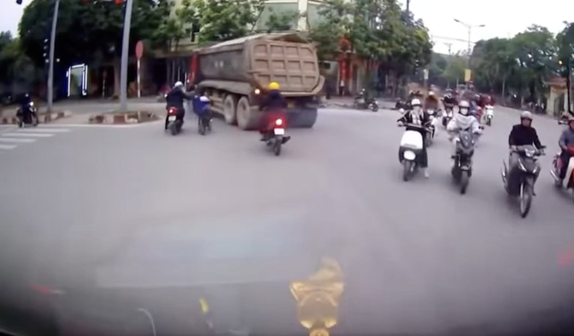 Cảnh tượng này được ghi lại từ camera hành trình của một chiếc ô tô vào sáng 9/12 tại TP Hòa Bình, tỉnh Hòa Bình. Một chiếc xe tải chở đất đá đang di chuyển từ đường Thịnh Lang rẽ trái sang đường Trương Hán Siêu. Do kích thước lớn, khi vào cua, chiếc xe tải gần như “lấn” hẳn sang dải phân cách. Lúc này, một em học sinh đang đạp xe sát ngay đó, vô tình tiến vào điểm mù, nơi tài xế xe tải không thể nhìn thấy.
