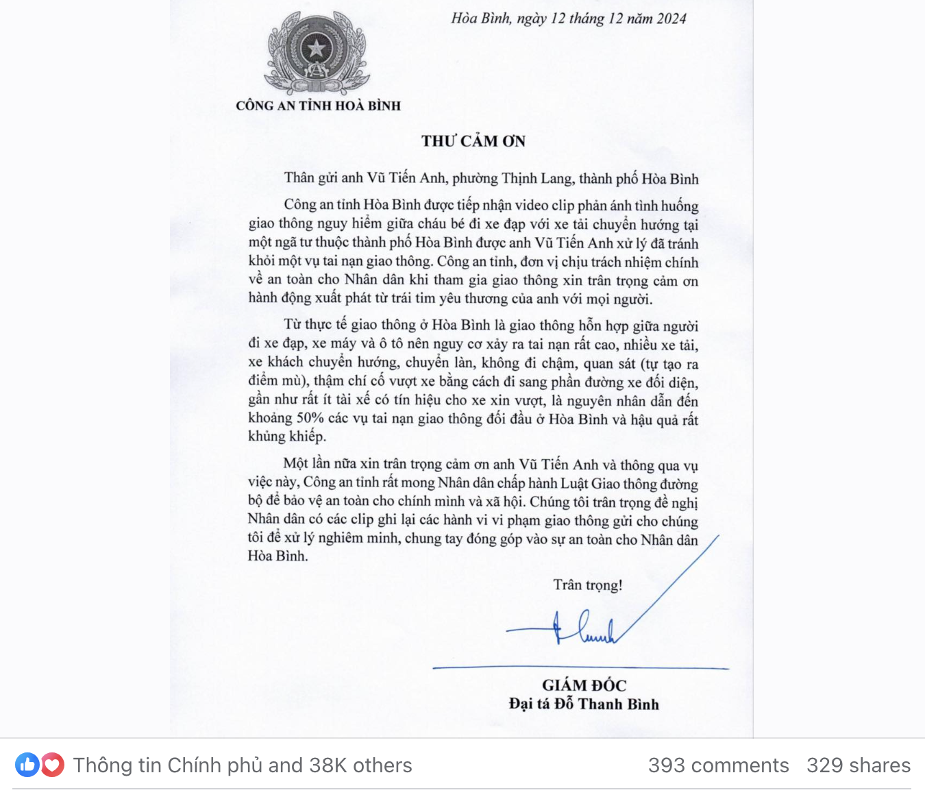 Đáp lại hành động tuyệt vời này, Đại tá Đỗ Thanh Bình, Giám đốc Công an tỉnh Hòa Bình, đã gửi thư cảm ơn chân thành tới anh Vũ Tiến Anh vì đã hành động kịp thời cứu cháu bé khỏi nguy hiểm.