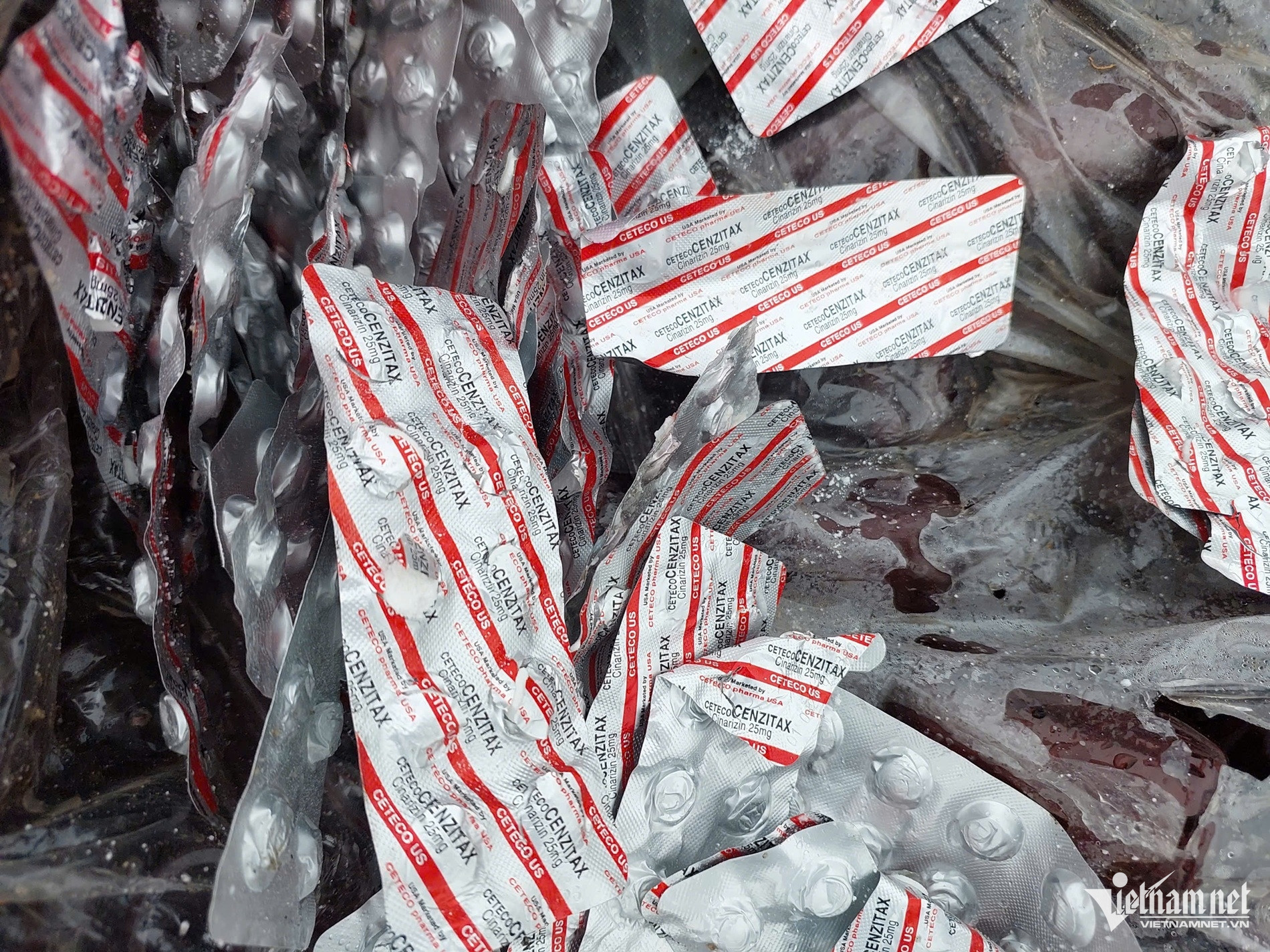 Đáng chú ý, xen lẫn giữa các bao tải chứa vỏ chai là rất nhiều vỉ thuốc còn nguyên, chưa qua sử dụng. Mặc dù được phủ sơ sài bằng lớp bạt đen, nhưng các vỉ thuốc vẫn bị lộ ra bên ngoài.