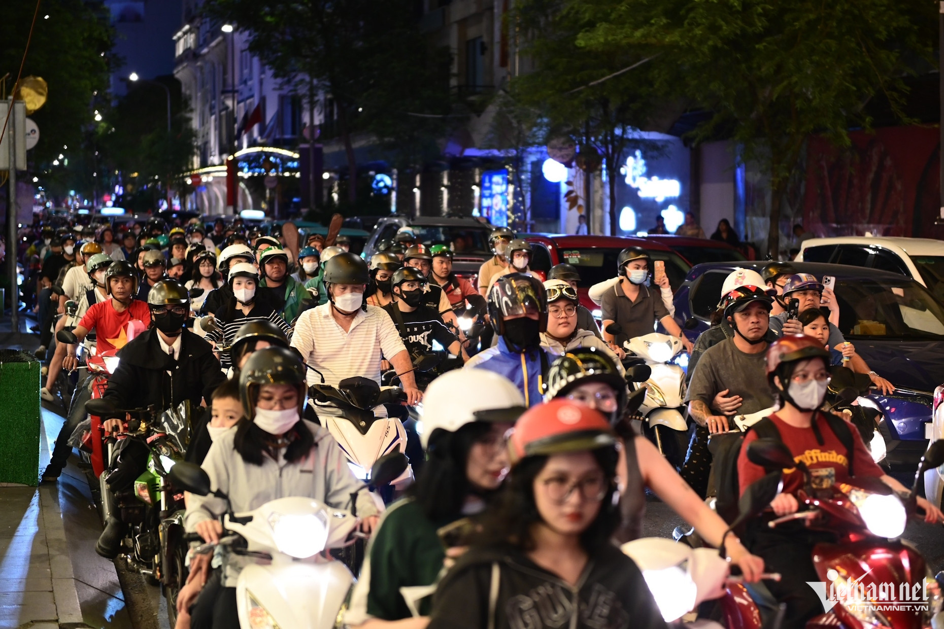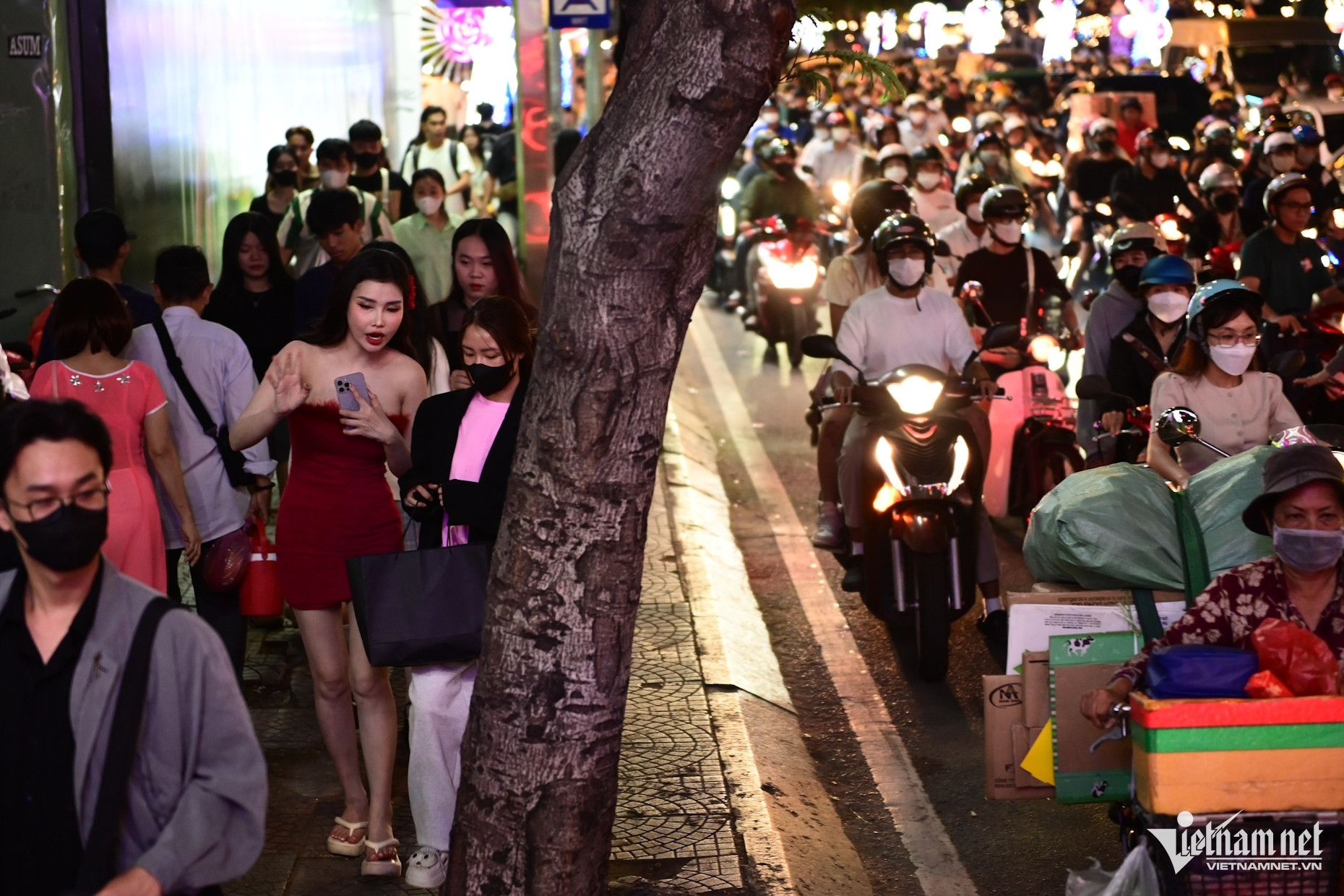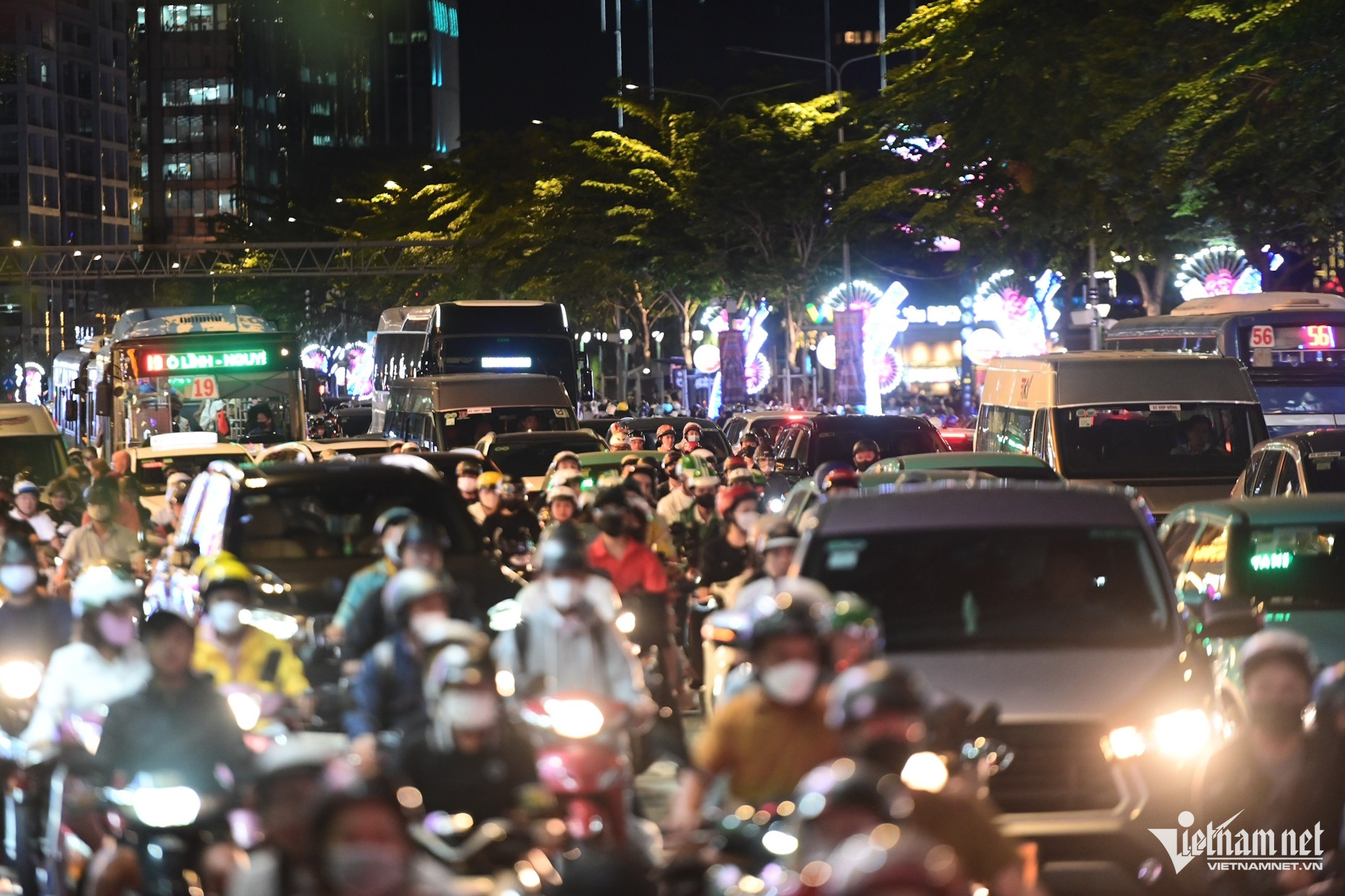 Càng về tối, dòng người liên tục đổ về khu trung tâm thành phố càng đông đúc. Phố đi bộ Nguyễn Huệ, công viên bến Bạch Đằng (quận 1), công viên bờ sông Sài Gòn (TP Thủ Đức) đông nghẹt người.