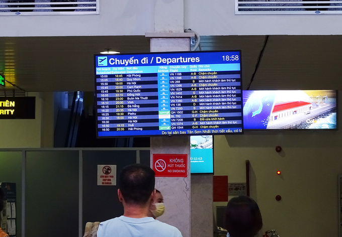 Tại sân bay Tân Sơn Nhất (TP HCM) lúc 19h, khu nhà ga nội địa, 5 màn hình thông báo lịch bay và tất cả màn hình khu vực check-in các hãng đều chạy dòng chữ thông báo sự cố kỹ thuật khiến những chuyến đến và đi đều trễ. Chuyến bay đến Hải Phòng trễ 3 giờ 45 phút, Quy Nhơn trễ 3 giờ 40 phút, Hà Nội trễ 3 giờ 30 phút...