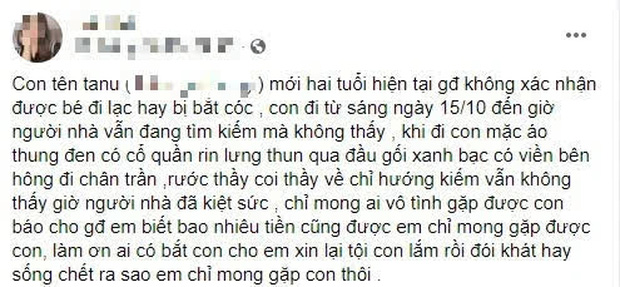 "Con tên Tanu, mới 2 tuổi, hiện tại gia đình không xác nhận được bé đi lạc hay bị bắt cóc. Con đi từ sáng 15/10 đến giờ người nhà vẫn đang tìm kiếm mà không thấy. Khi đi con mặc áo thun đen có cổ, quần jeans qua đầu gối, xanh bạc có viền bên hông, lưng thun, đi chân trần.