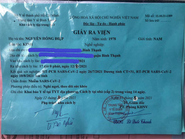 Sau 22 ngày điều trị tại viện, ngày 12/8 vừa qua anh Điệp đã nhận kết quả PCR âm tính, đã có kháng thể nên được xuất viện về nhà. Anh đã chiến thắng trở về, toàn bộ gia đình anh cũng đã PCR âm tính, đã khỏi bệnh, bình an.