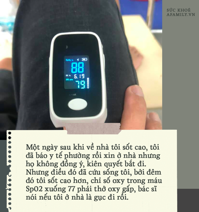 "Một ngày sau khi về nhà tôi sốt cao, tôi báo y tế phường rồi xin ở nhà nhưng họ không đồng ý, kiên quyết bảo đi. Nhưng điều đó đã cứu sống tôi, bởi đêm đó tôi sốt cao hơn, chỉ số oxy trong máu Sp02 xuống 77 phải thở oxy gấp, bác sĩ nói nếu tôi ở nhà là gục đi rồi", anh Điệp kể lại.