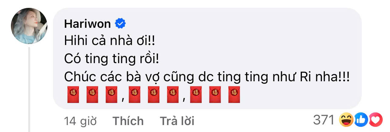 Sau đó, cô còn hài hước cập nhật tình hình cho cư dân mạng đã đạt kết quả như mong muốn là được Trấn Thành "ting ting". Hari Won còn gửi lời chúc tới mọi người sớm nhận được lì xì như mình. Màn đòi lì xì online của vợ chồng Trấn Thành một lần nữa khiến khán giả bật cười vì độ lầy lội của cặp vợ chồng quyền lực hàng đầu Vbiz.