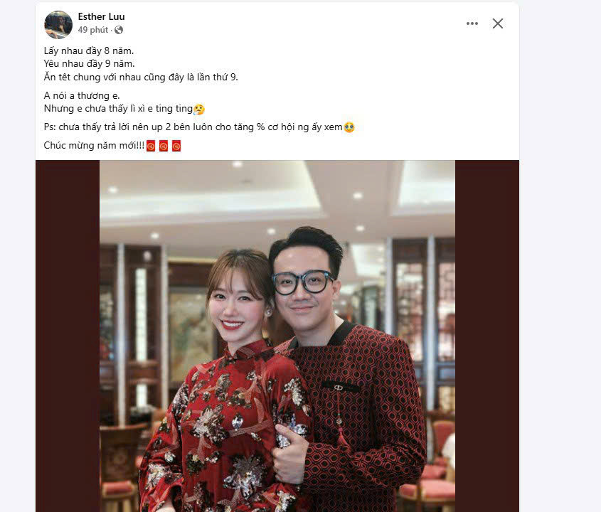 Hari Won viết: "Lấy nhau đầy 8 năm. Yêu nhau đầy 9 năm. Ăn Tết chung với nhau cũng đây là lần thứ 9. Anh nói anh thương em. Nhưng em chưa thấy lì xì em ting ting. Chưa thấy trả lời nên up 2 bên luôn cho tăng % cơ hội người ấy xem. Chúc mừng năm mới".