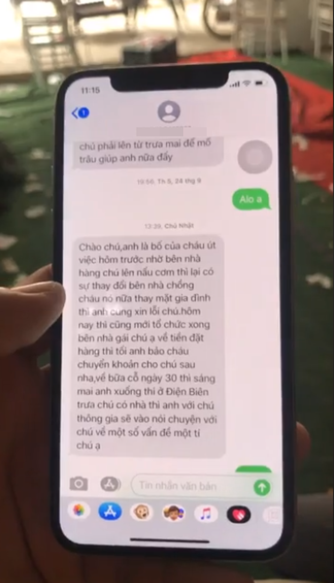 "Chào chú, anh là bố của cháu U. Việc hôm trước nhờ bên nhà hàng chú lên nấu cơm thì lại có sự thay đổi bên phía nhà chồng nhà cháu nó nữa. Thay mặt gia đình anh cũng xin lỗi chú. Hôm nay thì cũng mới tổ chức xong bên nhà gái chú ạ. Còn về tiền đặt hàng thì tối anh bảo cháu chuyển khoản cho chú sau nha. Về bữa cỗ ngày 30 thì sáng mai anh xuống Điện Biên, chú có nhà thì trưa mai anh với chú thông gia sẽ vào nói chuyện với chú về một số vấn đề một tí chú ạ", tin nhắn anh Long nhận được sau đó.