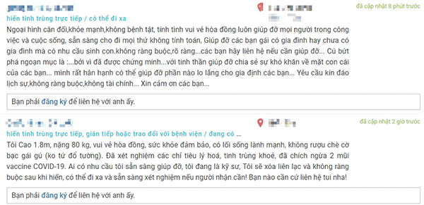 Vào một trang web "hiến" tinh trùng miễn phí đang hot trên MXH thời gian gần đây có thể dễ dàng thấy những lời rao "cho" kèm nội dung tự giới thiệu bản thân với hàng tá "ưu điểm", người nhận không cần lo lắng vì họ tự tin tư cách đạo đức cũng như "Gen tốt" như: "Tôi năm nay 33 tuổi, sống và làm việc ở Hà Nội. Cao 1m70, nặng 65kg. Tốt nghiệp đại học - thạc sỹ, thông minh, chịu khó, hiền lành, điềm đạm. Sức khỏe tốt, lối sống lành mạnh không hút thuốc, không rượu bia. Không mắc các bệnh di truyền, các bệnh truyền nhiễm, thường xuyên khám sức khỏe định kỳ. Tôi có thể đến nơi các chị em cần hiến, có thể đi xa, muốn giúp các bạn gia đình hiếm muộn, các bạn muốn làm mẹ đơn thân". Đi kèm với "Profile" hoàn hảo cùng phương thức liên hệ cho ai có nhu cầu.