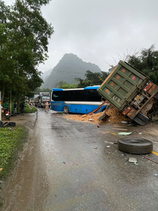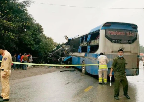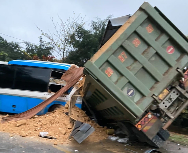 Tại hiện trường, xe khách nát đầu. Xe tải chở đất đè lên đầu xe khách. Thời điểm xảy ra tai nạn, khu vực trên có mưa khiến đường trơn, tầm nhìn hạn chế.