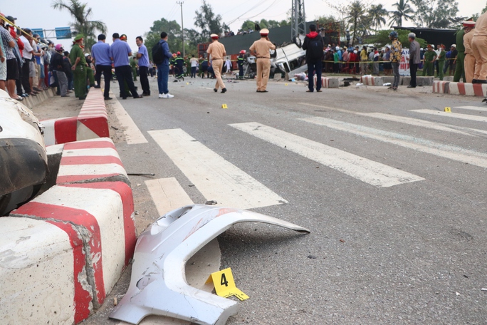 Tại hiện trường, chiếc ô tô khách bị hư hỏng nặng, nằm lật ngửa, nhiều mảnh vụn của xe vương vãi khắp nơi. Trên mặt đường có nhiều vết cà, được cho là hai xe va chạm rất mạnh.