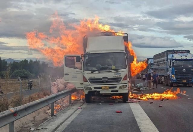 Dù tài xế đã nỗ lực di dời nhiều bao hàng hóa từ trên thùng xe xuống mặt đường nhằm giảm thiểu tổn thất, nhưng ngọn lửa vẫn bùng phát rất mạnh. Trong thời gian ngắn, đám cháy đã lan rộng và bao trùm hoàn toàn khu vực phía sau xe.