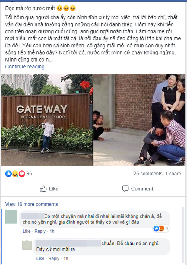 Bên cạnh đó, nhiều người bày tỏ sự đồng cảm và gửi lời chia buồn sâu sắc với gia đình em L. Sáng đưa con đi học, đến chiều lại nghe tin sét đánh ngang tai: con không còn nữa. Nếu đặt mình vào vị thế làm cha làm mẹ em thì đúng là không có ngôn từ nào có thể diễn tả được nỗi niềm xót xa này.
