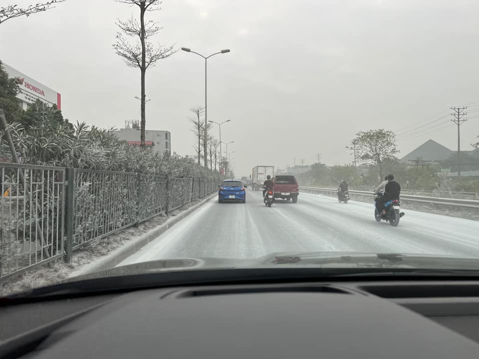Theo nội dung đăng tải, một đoạn đường quốc lộ 5, bao gồm cả mặt đường và thảm thực vật xung quanh (đoạn qua Khu đô thị Đặng Xá, huyện Gia Lâm, Hà Nội) bị bao phủ bởi một lớp bột màu trắng xóa, nhìn như băng tuyết.