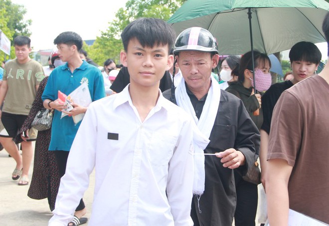 Sau khi con trai vào phòng thi, với vẻ mặt trầm ngâm, ông kê dép ngồi ở vỉa hè đợi con suốt 120 phút. Trao đổi với PV VietNamNet, ông cho biết tên là Võ Tá Dụng (SN 1968, xã Thạch Hạ, TP Hà Tĩnh) bố của thí sinh Võ Nguyên Hoàng (học sinh lớp 12D, Trường THPT Thành Sen). Trước kỳ thi một tuần, vợ của ông mất đột ngột vì căn bệnh hiểm nghèo.