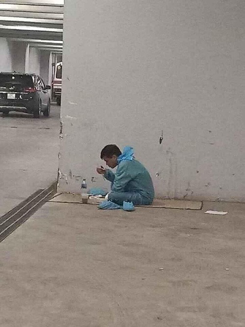 Trước đó, bức ảnh người đàn ông mặc nguyên quần áo bảo hộ ăn vội hộp cơm trên manh chiếu nhỏ trải tạm sát bên tường trong khu sân bay nhanh chóng được lan truyền rộng rãi trên mạng xã hội.