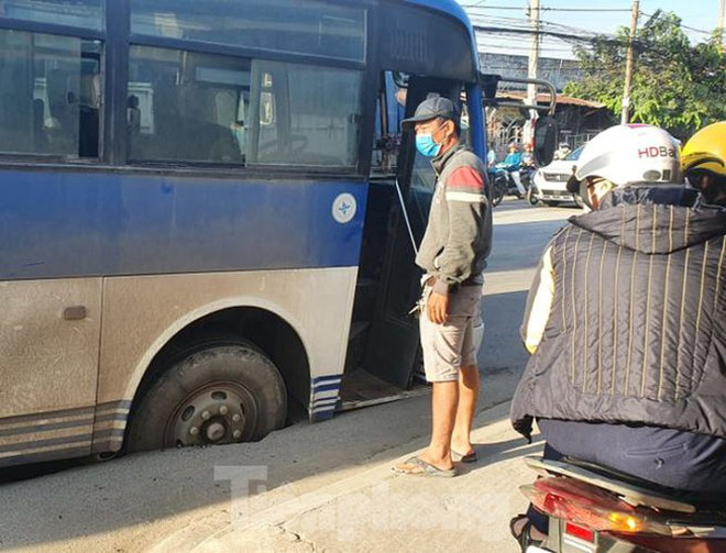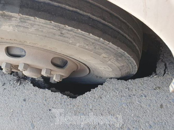 Ghi nhận của PV, cho thấy bánh xe bị sập dưới hố, thân xe chạm mặt đường. Một hố sâu và rộng lộ rõ xung quanh bánh trước xe khách.