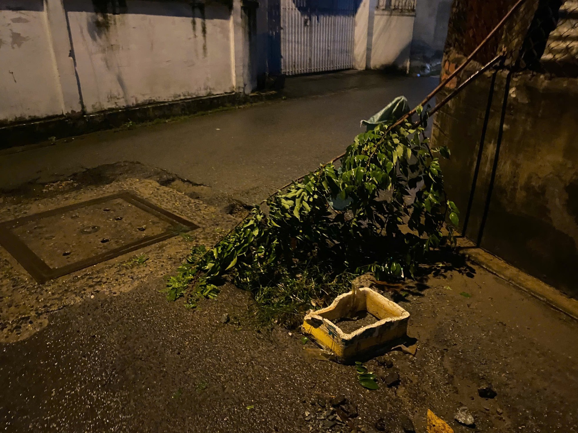 Ngoài Đường số 5, tại Đường số 10, thành phố Thủ Đức ngay cạnh hố ga thoát nước cũng xuất hiện 1 điểm sụt lún mới. Người dân phải cắm những cành cây, bao tải để cảnh báo người đi đường.