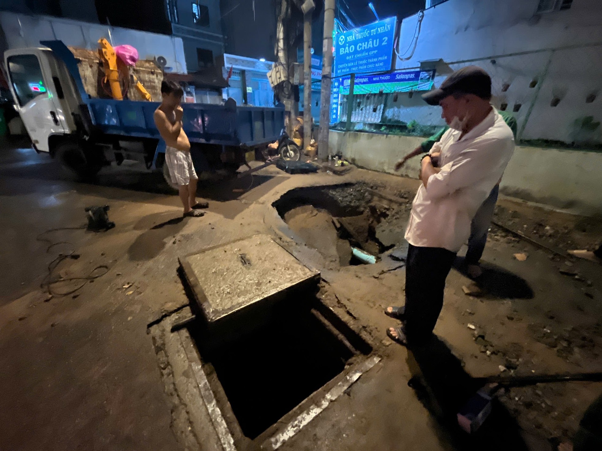 Một số nhân viên đô thị đã phải túc trực kiểm tra tình hình thoát nước và báo cáo tình hình điểm sụt lún lên cơ quan chức năng trước khi có phương án khắc phục sự cố.