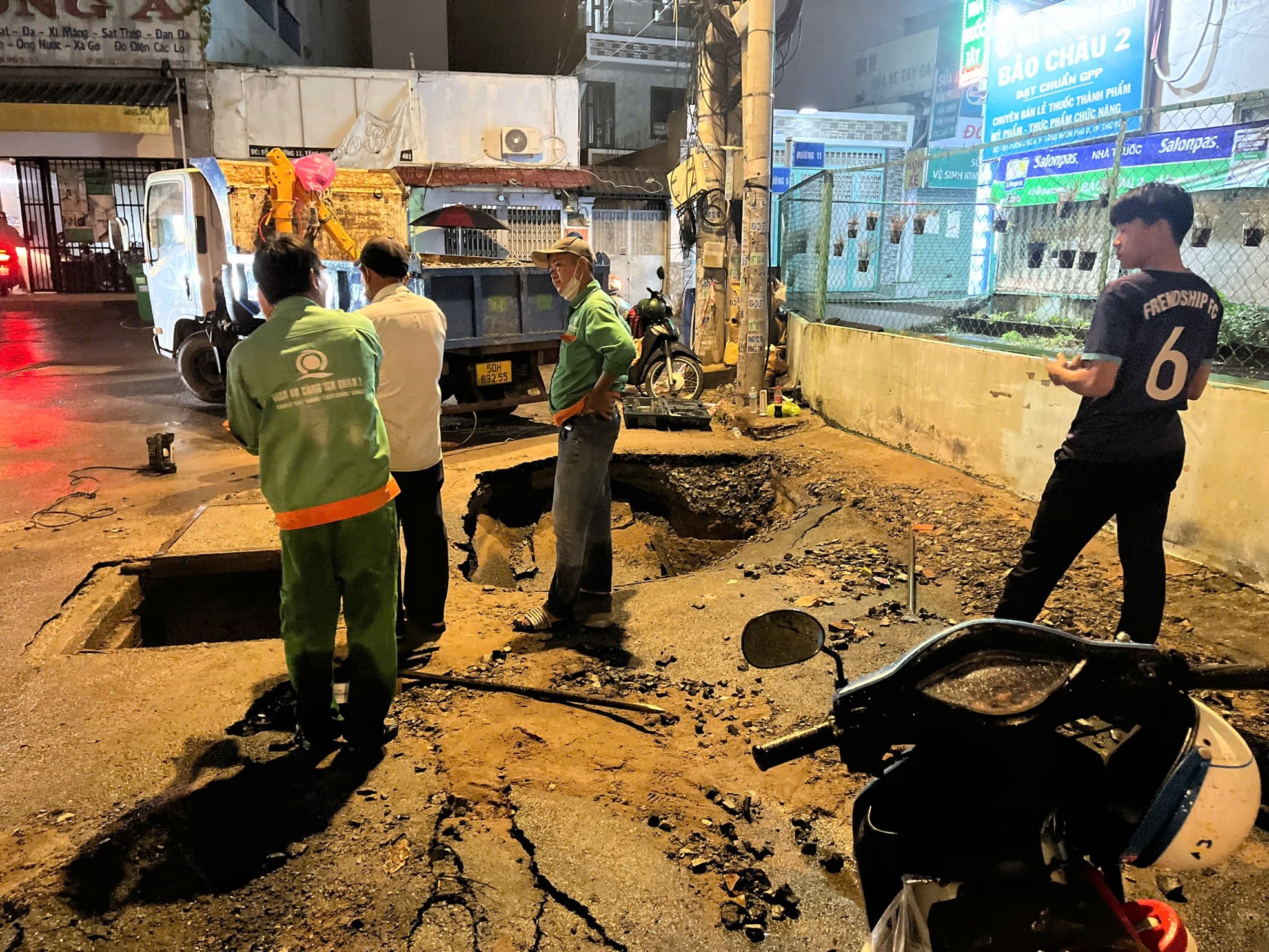 Một nhân viên đô thị đang kiểm tra cho biết điểm sụt lún này khá lớn nên việc khắc phục cần có thời gian. Điểm sụt lún này xuất hiện ngay sau cơn mưa lớn chiều cùng ngày, nằm gần hố ga thoát nước trên đầu Đường số 5, phường Tăng Nhơn B, thành phố Thủ Đức.