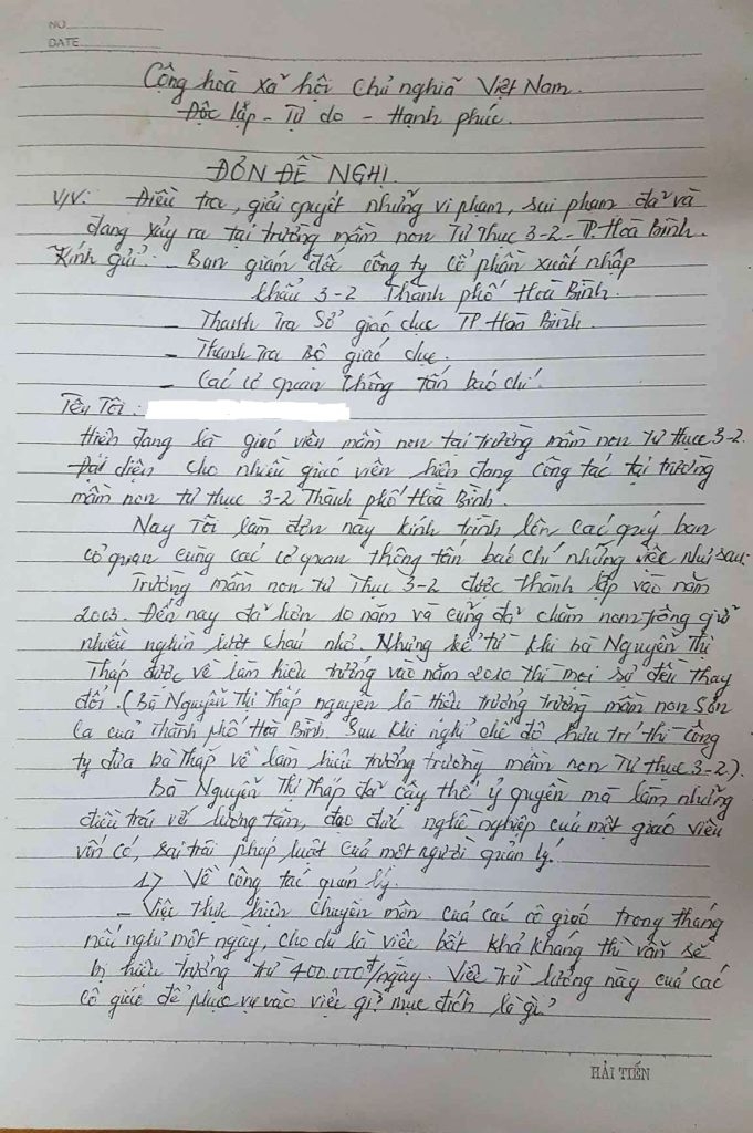 | Giáo viên gửi đơn tố nhiều tiêu cực tại trường mầm non chất lượng cao 3-2 |