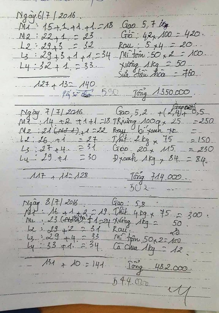 Vị này chỉ tay vào những số liệu ghi chép trong cuốn sổ, giải thích: “Đây, ví dụ như trong ngày 6/7/2016, nhà bếp nhập về 5,7kg gạo, giò 4,2kg, rau 5 mớ, mì tôm 50 gói, xương 1kg, tổng hết 590.000 đồng. Lấy số tiền này chia cho 140 cháu hôm đó đi học thì tính ra khẩu phần ăn mỗi cháu chỉ được hơn 4.200 đồng”.