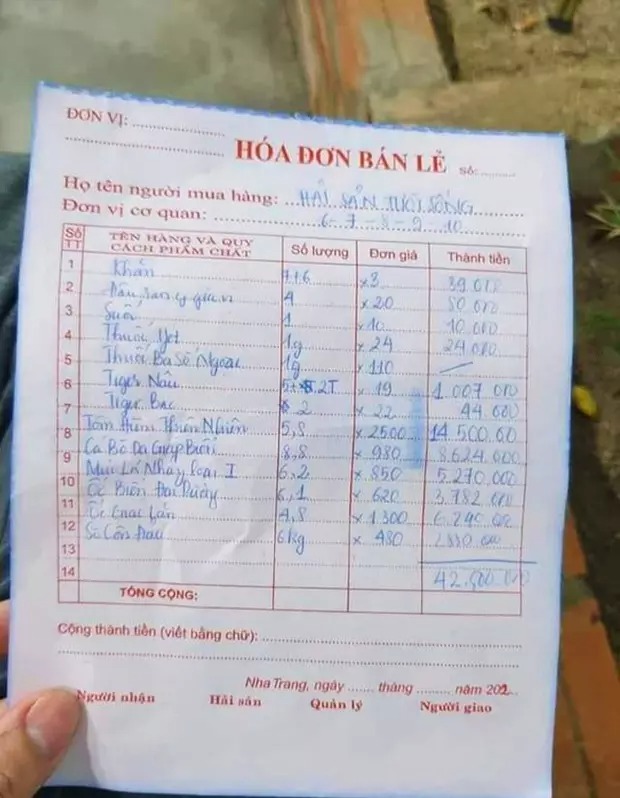 Đoàn mình đi 14 người, lúc ra thanh toán thì giá như thế này. Mọi người cho em xin số hotline bên Nha Trang em muốn trình báo về việc chặt chém khách du lịch, như thế này em thấy du lịch Nha Trang sợ quá ạ".