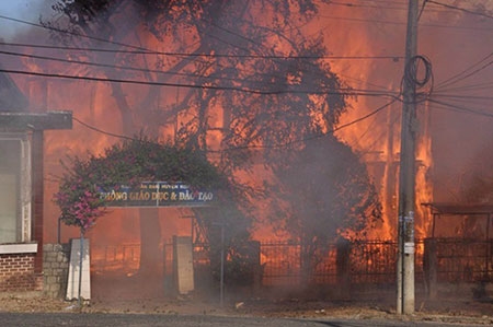 Ông Trần Duy Bằng - nhà đối diện với Phòng GD&ĐT huyện cho biết: “Lửa xuất phát từ tầng hai ngôi nhà gỗ của Phòng GD&ĐT, nhưng do thời tiết quá nóng, kèm theo gió to nên ngọn lửa cháy nhanh, khó khống chế”.