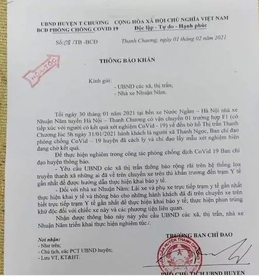 Trước đó, vào chiều 1-2, Ban chỉ đạo phòng chống dịch Covid-19 huyện Thanh Chương (Nghệ An) đã ký công văn hỏa tốc thông báo khẩn gửi các xã, thị trấn và nhà xe Nhuận Năm về việc phát hiện trường hợp F1 và thực hiện phòng, chống dịch Covid-19.