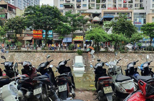 Chiều 17/6, nhiều người tham gia giao thông hoảng hốt khi chứng kiến chiếc ô tô màu trắng lao từ đường Tam Trinh (Hoàng Mai, Hà Nội) xuống sông Kim Ngưu.