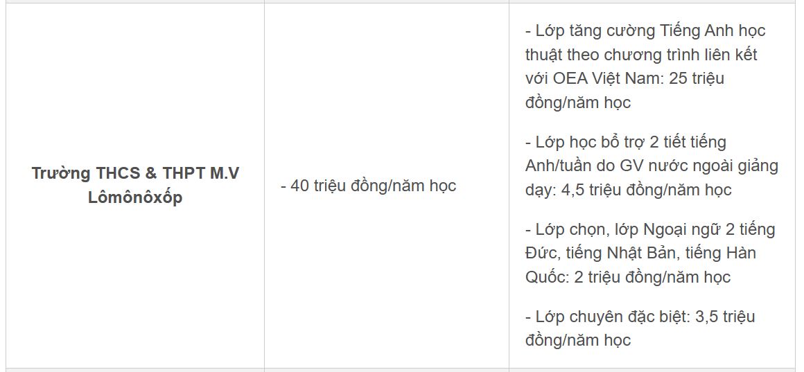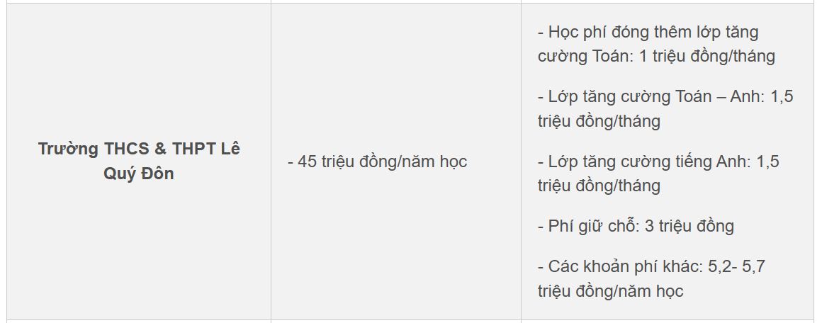 Hay tại Trường THCS & THPT Lê Quý Đôn, ngoài học phí 45 triệu đồng/năm học, trường cũng đưa ra mức học phí đóng thêm lớp tăng cường Toán là 1 triệu đồng/tháng, lớp tăng cường Toán – Anh là 1,5 triệu đồng/tháng, lớp tăng cường tiếng Anh: 1,5 triệu đồng/tháng.