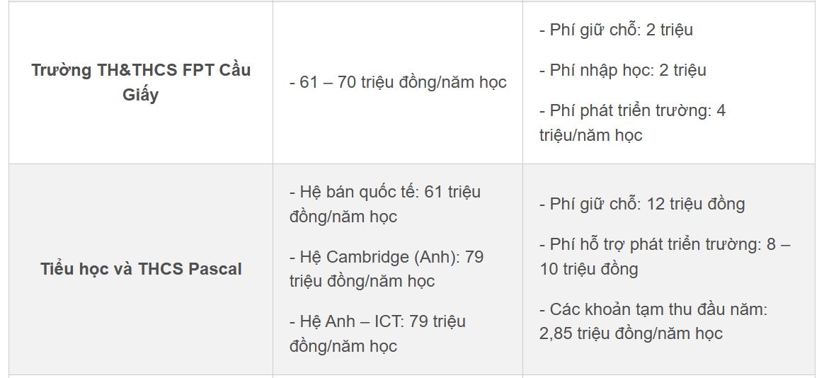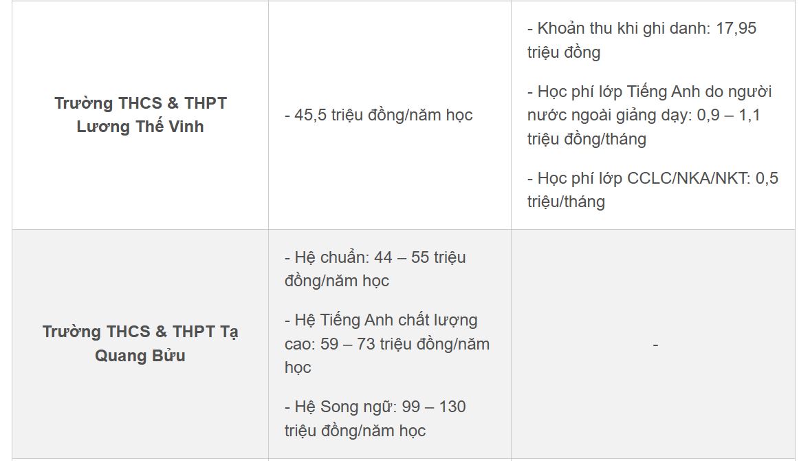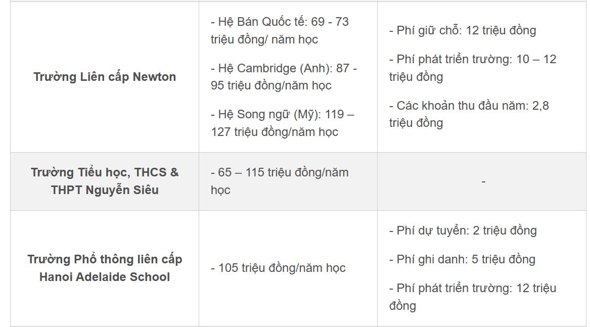 Những trường chia thành các hệ Bán quốc tế, Cambridge (Anh) hay Song ngữ (Mỹ) sẽ có mức học phí lên tới vài trăm triệu đồng như: Trường Phổ thông liên cấp Hanoi Adelaide School, Trường Liên cấp Việt – Úc Hà Nội, Trường Phổ thông Song ngữ liên cấp Wellspring…