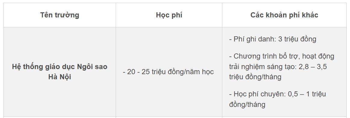Ví dụ, học phí bậc THCS của Hệ thống giáo dục Ngôi sao Hà Nội dao động từ 20 – 25 triệu đồng/năm học tùy từng khối, song phụ huynh cần đóng thêm 3 triệu đồng/tháng cho các chương trình bổ trợ nâng cao tiếng Anh, thể thao, kỹ năng sống, tin học… hay 500.000 đồng/tháng cho các hoạt động trải nghiệm sáng tạo, tham quan dã ngoại tổ chức hàng tháng bên ngoài trường. Ngoài ra, trường cũng thu 2,5 triệu đồng/kỳ học phí chuyên.