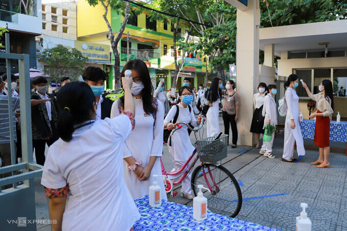 Bà Lê Thị Bích Thuận, Giám đốc Sở Giáo dục và Đào tạo Đà Nẵng, cho biết các trường thực hiện thông điệp "5 K" (khẩu trang, khử khuẩn, khoảng cách, không tụ tập đông người, khai báo y tế) chung sống an toàn với Covid-19, kèm theo đó là Sổ tay phòng, chống dịch do Bộ Giáo dục và Đào tạo phát hành.