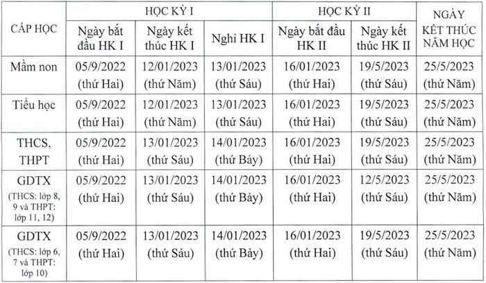 Bộ GD-ĐT cho phép các tỉnh, thành xây dựng kế hoạch năm học riêng phù hợp với đặc điểm, điều kiện thực tiễn ở địa phương mình, đảm bảo giáo dục phổ thông có 35 tuần thực học (kỳ I 18 tuần và kỳ II 17 tuần); giáo dục thường xuyên có 32 tuần thực học với lớp 8, 9, 11,12 và 35 tuần với lớp 6, 7, 10.