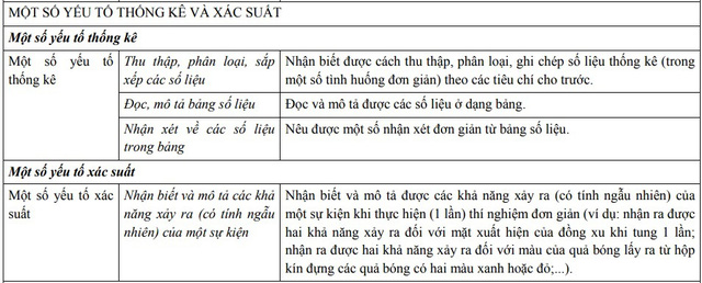 Về phần xác suất, học sinh làm quen với khả năng xảy ra (có tính ngẫu nhiên) của sự kiện, biết mô tả những hiện tượng liên quan các thuật ngữ có thể, chắc chắn, không thể, thông qua một số thí nghiệm, trò chơi, hoặc xuất phát từ thực tiễn. Sang đến lớp 3, lớp 4 và lớp 5, sẽ là nâng cao hơn đối với xác suất và thống kê.