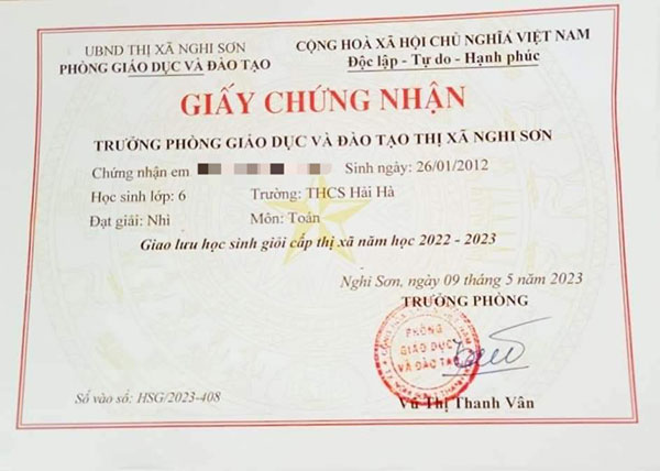 Hiện tại, khi kết thúc năm học (chương trình dạy học) nhưng B. L. chưa có giấy khai sinh nên nhà trường không nhập được dữ liệu điện tử cho em này. Kết quả tổng kết cuối năm, B.L, đạt học sinh giỏi và em này cũng đạt giải nhì môn Toán tại kỳ thi giao lưu học sinh sinh giỏi của thị xã năm học 2022 – 2023.
