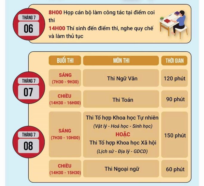 Ông Võ Thiện Cang, Trưởng Phòng Khảo thí và Kiểm định chất lượng Sở GD-ĐT TP HCM, khuyên thí sinh: Đúng 14 giờ ngày 6-7, các em có mặt tại điểm thi: xem phòng thi, nắm quy chế và kiểm tra lại các thông tin cá nhân. Nếu có điều chỉnh báo lại cho cán bộ coi thi (CBCT) và nhớ cầm theo giấy tờ minh chứng để chỉnh sửa lần cuối. Sáng đi thi có mặt đúng giờ. Chiều đi thi vẫn có mặt đúng giờ, đừng chủ quan mà vội vàng rồi quên giấy tờ cá nhân hay máy tính ở nhà. Lưu ý, không được đi trễ, nếu trễ sau khi tính giờ làm bài 15 phút, sẽ không được tham gia kỳ thi.