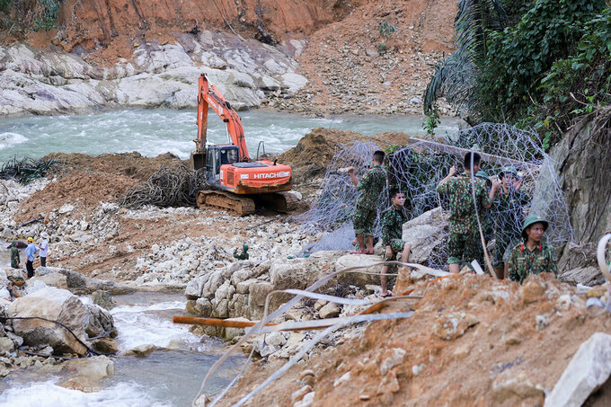 Ngay khi quay lại hiện trường, các chiến sĩ công binh lội bùn, thay phiên nhau đưa các rọ đá xuống khu vực sẽ đắp đập để nắn dòng sông Rào Trăng. Hai kỹ sư xây dựng cầu đường của Sở Giao thông Vận tải tham gia đánh dấu vị trí múc đất, tạo dòng chảy mới cho sông.