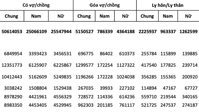Theo thống kê, cả nước có khoảng 2.225.900 người ly hôn/ly thân, trong đó hơn 963.300 nam và gần 1.262.600 nữ.