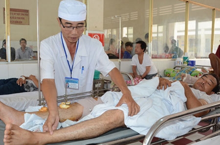 Tài công Nguyễn Hùng Cường điều trị vết thương gãy xương đùi phải tại bệnh viện. Ảnh: Cửu Long |