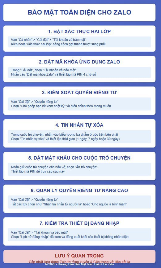 - Nếu nghi ngờ tài khoản bị xâm phạm, liên hệ ngay với hỗ trợ Zalo để được trợ giúp.