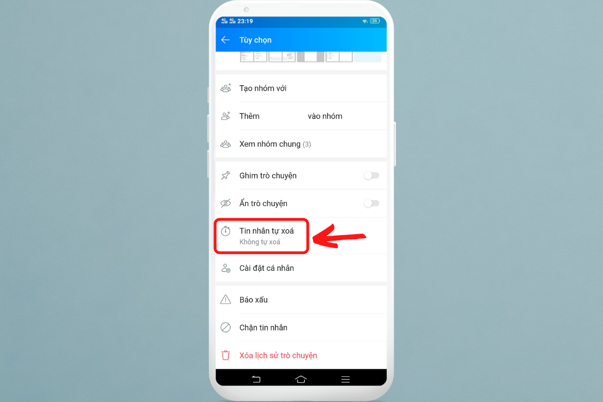 - Chọn “tin nhắn tự xóa” và thiết lập thời gian theo nhu cầu.