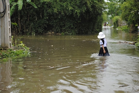 Nhiều em học sinh cấp 1 vẫn phải lội nước sâu để về nhà |