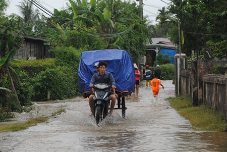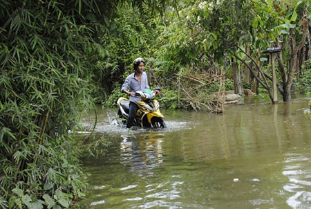 Đường làng ngập sâu, xe máy bị chết máy không đi được |