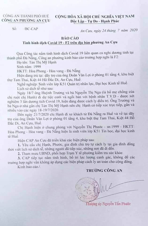 Theo Công an phường An Cựu, qua công tác nắm tình hình, đơn vị đã triển khai nhiều biện pháp liên quan đến trường hợp nghi là F2 của ca Covid-19 tại Đà Nẵng.
