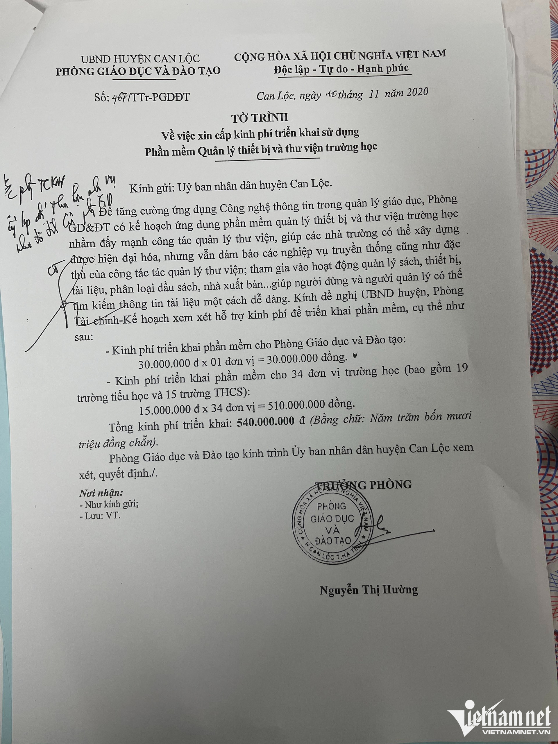 Ngày 10/11/2020, bà Nguyễn Thị Hường, Trưởng Phòng GD-ĐT huyện Can Lộc gửi tờ trình tới UBND huyện xin cấp 540 triệu đồng để mua phần mềm quản lý thư viện thiết bị (TVTB) và trường học cho 34 đơn vị.